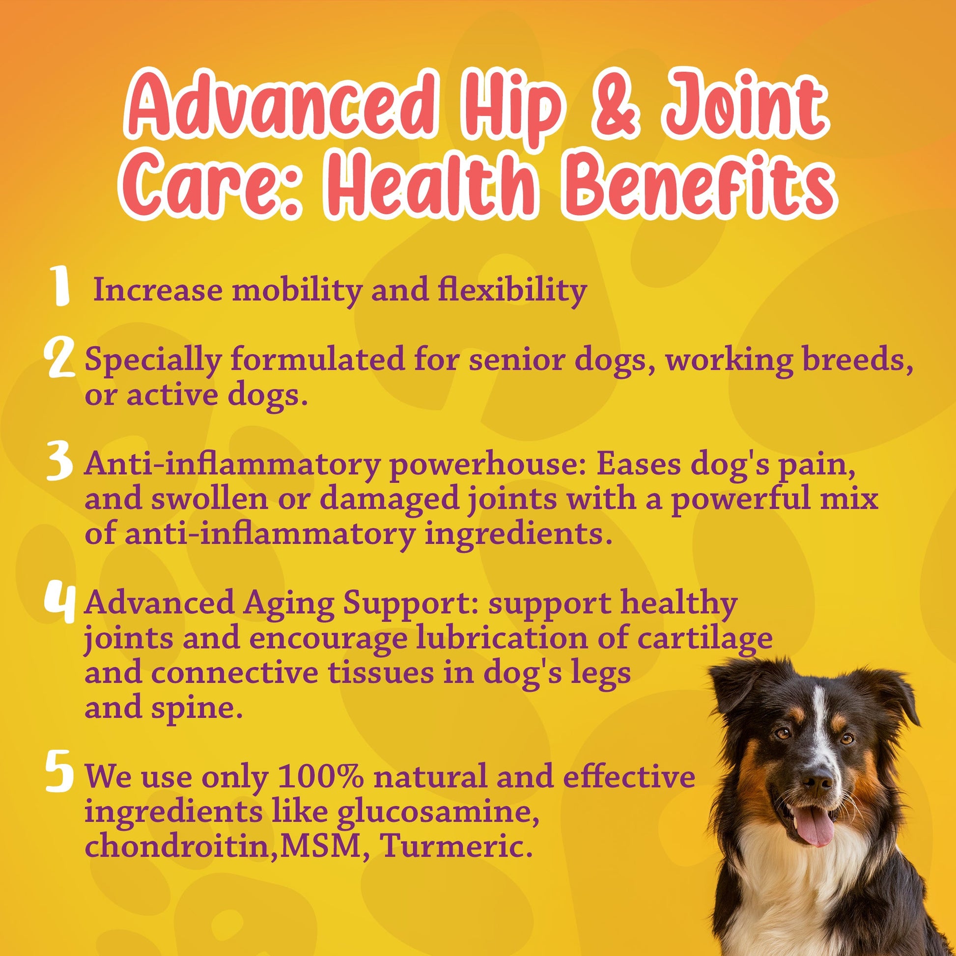 Formulated with a potent combination of glucosamine HCI, MSM, chondroitin sulfate, turmeric, and more, this advanced supplement helps maintain healthy cartilage, ease stiffness, and support mobility—so your pup can keep chasing balls, going on walks, and enjoying life to the fullest.
